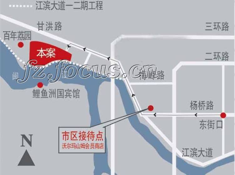 南侧紧临闽江延绵900多米,与鲤鱼洲国宾馆隔江相望,西侧与"荔园度假村"成片茂密的百年荔枝林相邻,规划中的滨江大道从项目前穿过。距东街口15公里,20分钟车程即可抵达。