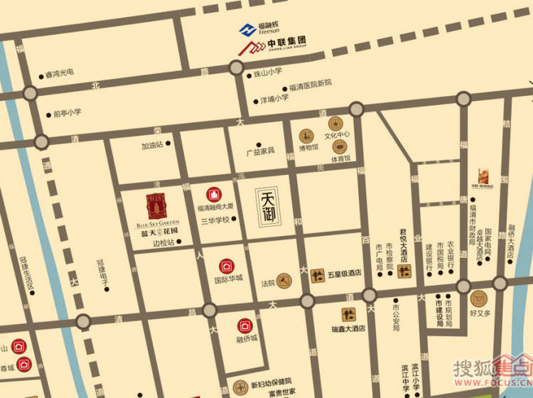 中联蓝天花园位于福清市清泓街南侧,福人大道西侧。中联•蓝天花园,中联集团继开发中联·锦绣尚品、中联·江滨御景之后又一实力巨作,雄踞于福清市较具活力的西区核心板块,紧临两馆一中心以及风光秀美龙江滨四大主题公园。信步休闲,左右繁华,地理位置极其优越。
