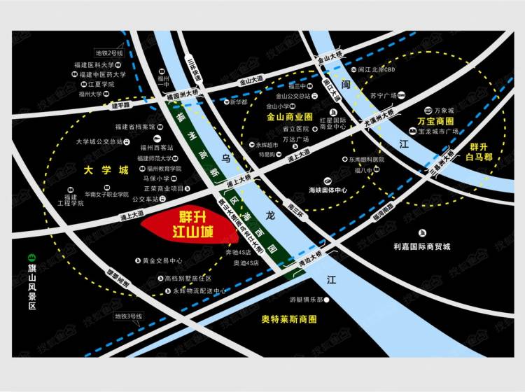 群升江山城位于浦上大桥桥头堡,福州浦上大道与旗山大道交汇处。占据海西高新区核心,享有便捷交通和不可估量的区域发展潜力。项目占地334亩,规划28栋新古典Artdeco风格高层建筑,是福州高新区规模宏大的低密度大盘。过一座桥直抵仓山万达,同享奥体商圈,区域繁华不言而喻;社区内规划超大私家内湖、60000㎡公园级园林、4000㎡鼎级会所、2000㎡社区医院、12班幼儿园;坐拥旗山风景区、原生态高岐河、滨河公园等自然资源,一站式繁盛配套应有尽有,幸福生活一步到位!