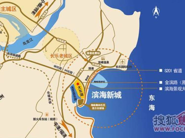 大东湖项目东连南北走向的文武路、西侧全境与4000亩东湖相接壤、南邻海峡奥林匹克高尔夫球场及滨海景观大道、北接两港连接线的201省道。