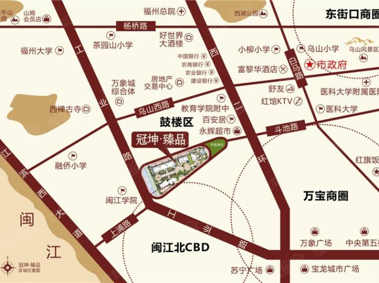 项目位于斗池路与工业路交汇处,东临万宝商圈及北江滨核心商务区,西接金山大桥直达金山中心,南拥凤凰居住组团,北有福州大学、闽江大学及在建的华润万象城。