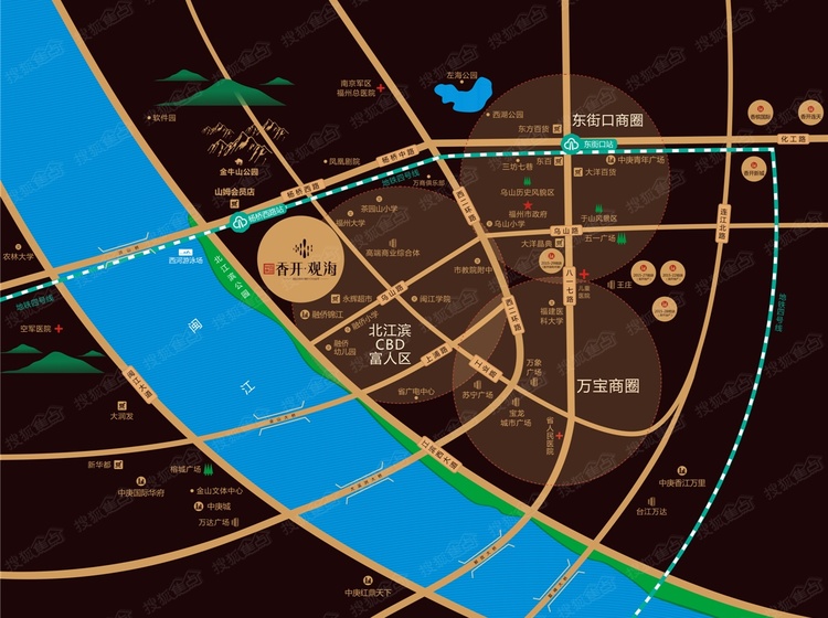 香开观海寡占鼓楼最后一线观江宝地,雄踞鼓楼江滨西大道,福州传统隐贵富人区锦江高端生活区旁。于醇熟都市生活圈核心,总裁级尊荣礼遇城市脊梁。东街口、鼓楼万象城、万宝苏、闽江北CBD四大商圈近在咫尺,3分钟即达山姆会员店。江滨公园、西河公园、金牛山公园三大主题公园环伺。多维立体路网轻松畅达全城,3分钟即达地铁4号线站。