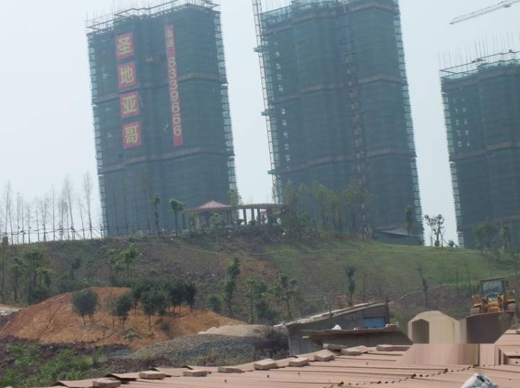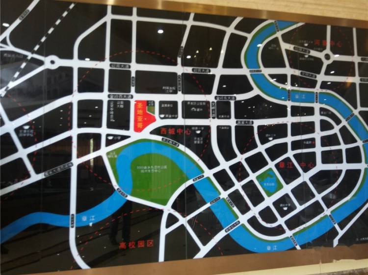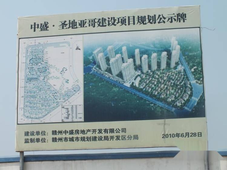 中盛·圣地亚哥位于章江上游北岸边,黄金开发区(赣州市经济技术开发区)宝福路与金岭路交汇处禹冰苑北面.项目背靠金岭路、南望千里章江及5000亩湿地生态公园、东依山地森林公园、西临宝福路。圣地亚哥占地155余亩,总建筑面积329743.22平米,由13栋高层住宅建筑、83栋多层洋房建筑、1栋高层公寓及一条商业步行街和大型地下停车场,分为四大主题组团,并由此组成生态社区。
