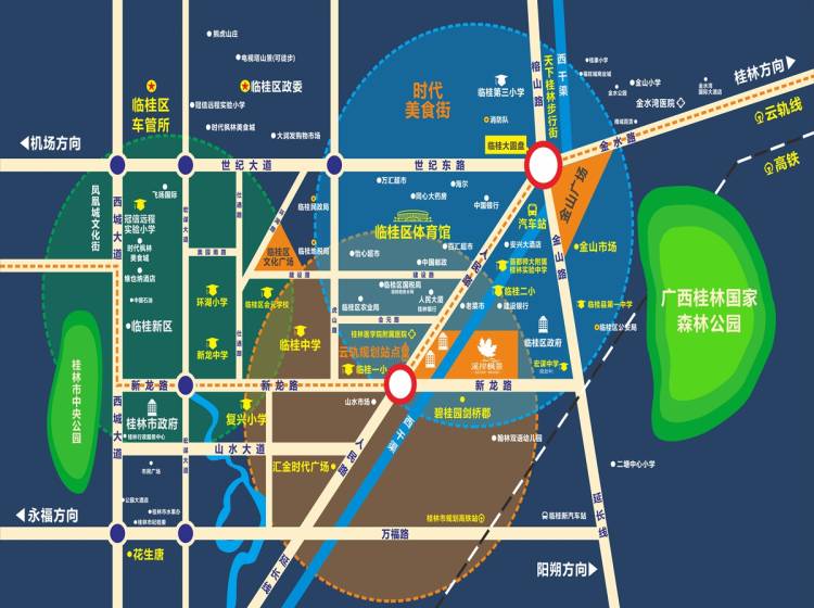 幼儿园:机关幼儿园 中小学:临桂一下、临桂二小、复兴小学、环湖小学、临桂中学、师大附中 大学:桂林山水职业学院 综合商场:花生唐、凤凰荟、南城百货、天下步行街 医院:桂林医学院(第二附属医院)、临桂西城医院、临桂县人民医院 银行/ATM :中国银行、工商银行、农业银行、建设银行