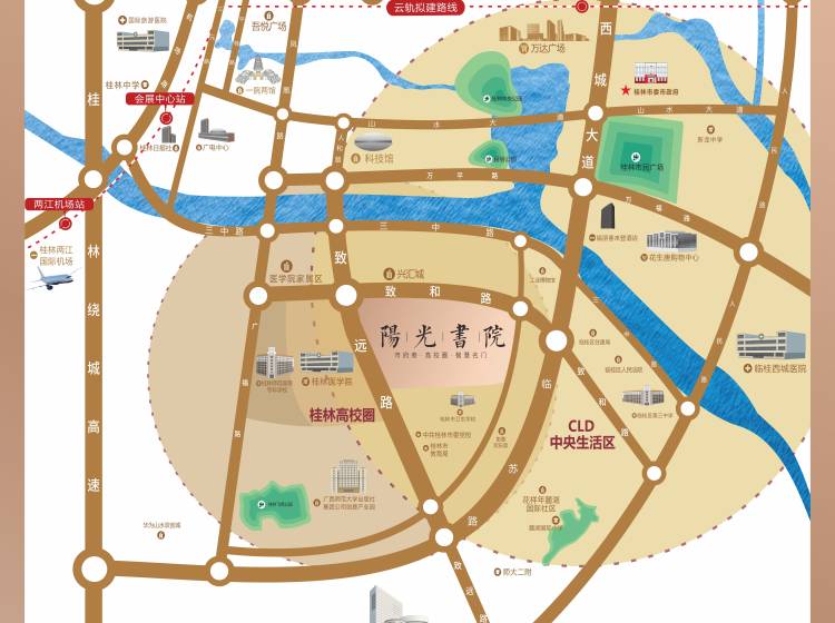 利嘉阳光书院是由桂林嘉泽地产倾力打造的桂林排名前列以高校圈文化生活为特色的高品质、高品味住宅小区。项目毗邻桂林市政府,坐落于文教中心、商业中心、行政中心、景观中心等四大中心为一体的CLD桂林中央生活区。该板块是政府重点打造的文教板块,与桂林医学院一街之隔,近揽桂林师范高等专科学校、桂林市职业教育中心学校、桂林卫生学校、中共桂林市党校等各大高校,并近距离辐射麓湖国际小学、师大二附、临桂第三中学、新龙中学等,为业主培育青春时尚、书香四溢的文化氛围,带来超居住的精神文化熏养。 项目总用地面积19182㎡,总建筑面积93000㎡,一共由6栋住宅和近5000㎡的沿街商铺组成,其中住宅均为89-129㎡高拓实用美宅。由特级资质中国华西承建,泰国知名设计师主笔,匠心筑造现代简约的坡地化院落式围合住区,并重金聘请中国鼎级花样年国际物业,正在洽谈引进品牌书店、知名咖啡屋等时尚文化生活配套,线上线下整合教育资源、医疗保健资源,真正为名门智士量身定制全生命周期的康养、文化生活圈层。