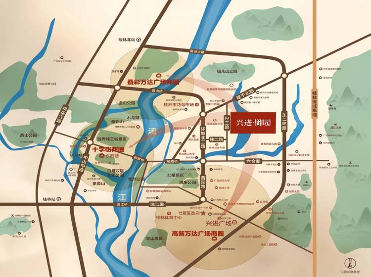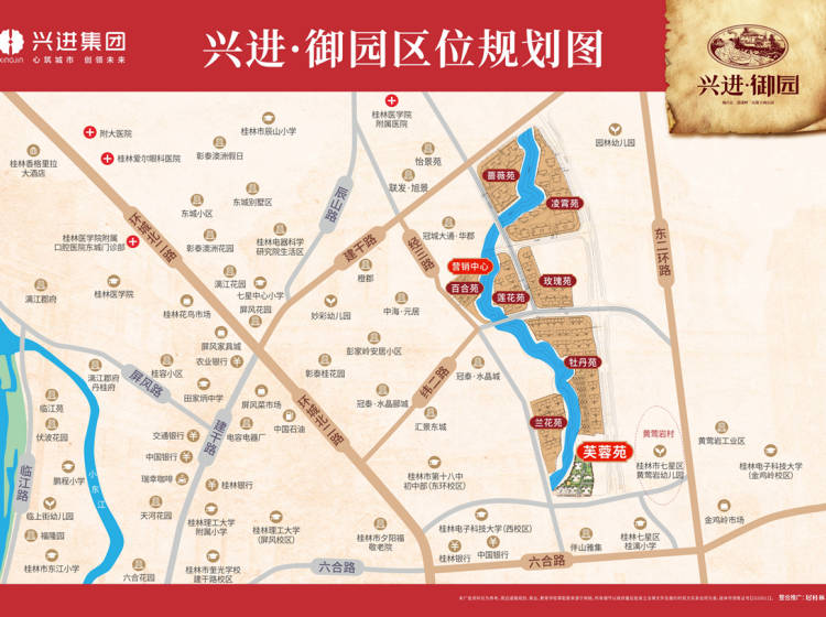 兴进御园项目坐落于七星区核心居住区,漓江东岸,建干北路南侧猫儿山片区,由兴进集团从世界山水到人文桂林,以21年学院派文化意识,再续城芯先进作品而打造。总占地约150亩,总建筑面积约20万平方米。超低的建筑密度、高绿化的意式园林,巧妙利用灵剑溪布局,构造出具有震撼力的20万㎡的托斯卡纳皇家庄园。项目规划有洋房、合院别墅、主题商业街、高端会所、无边游泳池和品牌幼儿园,周边配套有丰富的自然景观资源和教育资源。既可以享受到优质的生活环境,又可以享受成熟舒适便捷的生活方式 。