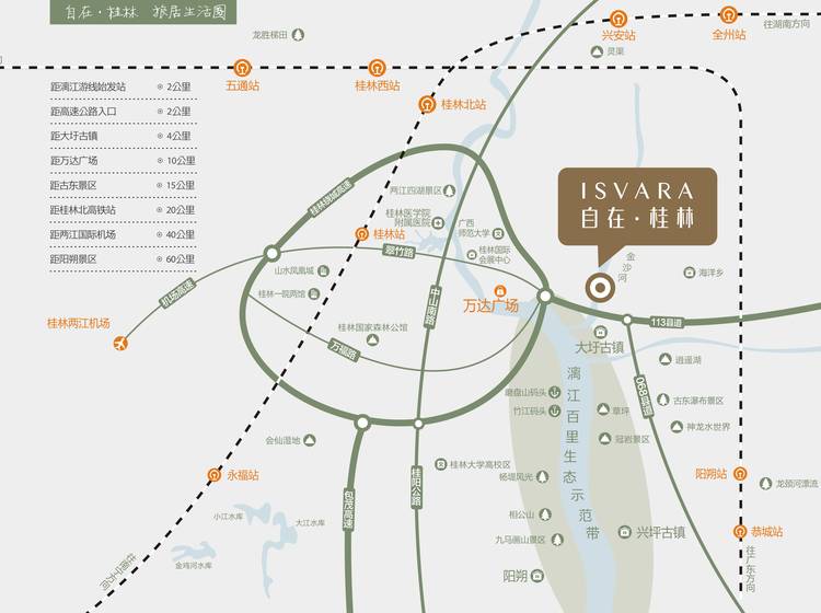 整体简介 自在·桂林位于桂林市灵川县,所处位置为漓江东岸“百里生态示范带”的黄金地段,距桂林市区约15公里,是桂林通往阳朔的必经之地。项目总占地面积近1500亩,由承和集团携手众多国内外知名设计行业巨擘耗时6年规划呈现。物业类型涵盖酒店、商业、文旅、购物、美食等业态,预计投资额将超24亿。自在·桂林一期由309亩美好度假生活社区及285亩户外野奢度假营地组成,内设9大主题风格酒店产品,五星级精奢装饰,打破传统模式,将传统五星酒店商业抽离出来形成22大主题商业部落,并采用“合伙模式”共构项目独有的特色创新型商业新景象。