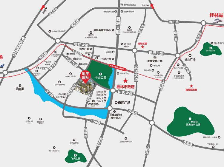 佳城地王国际位于临桂新区山水大道与凤凰路的交汇处,与中央公园仅有一路之隔,与桂林市政府也只有900米的距离,区位优势明显。桂林地王国际是由佳诚地产投资开发的,佳诚地产有20年的开发历史,在桂林、南宁有多个高端项目,如信佳华庭、叠彩名门、半山阅江台、资本大厦、地王国际和南宁重要商业配套海吉星广场等,因开发的项目各具特色,在市场赢得良好信誉。