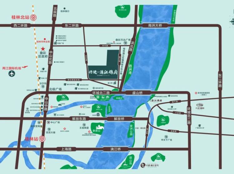 兴进漓江锦府项目位于中国桂林·叠彩区·漓江畔,叠彩万达广场南500米。距离叠彩万达广场、传统商圈北极广场、沃尔玛不到5分钟路程,依托中山北路、环城北路、东二环,大交通格局成熟便利,极速抵达十字街商圈和七星区腹地。项目隶属叠彩实验学校和机关幼儿园学区,教育资源优质;项目区域内匹配的医疗配套完善。