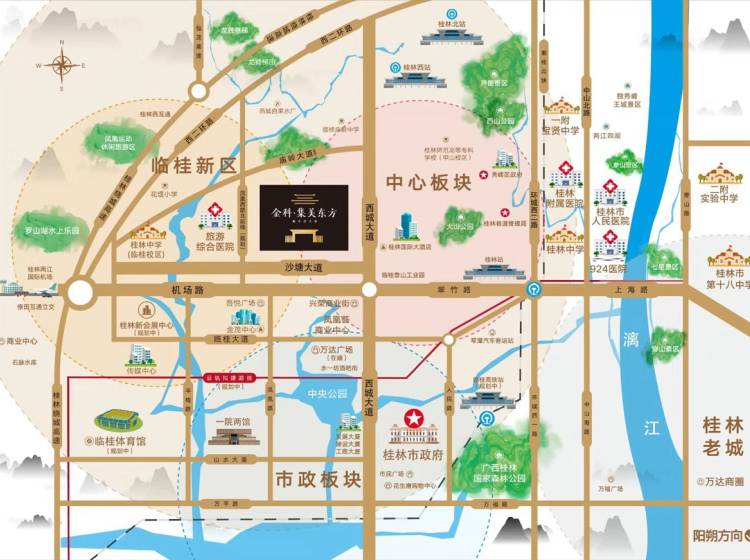 环城水系、一院两馆、桂林旅游综合医院、吾悦广场、万达广场(在建)、凤凰荟、真龙汽车博览园