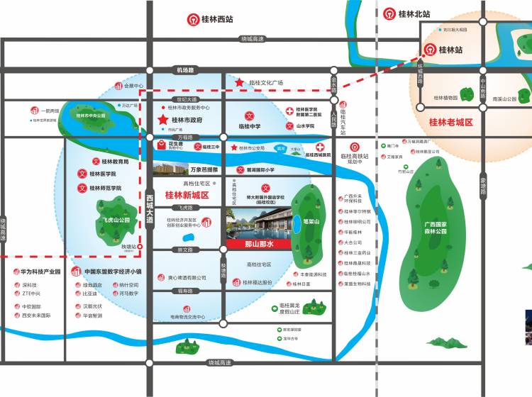 项目附近可乘61/62/67/85/89/106路等公交车到达桂林各地区,距离桂林北站、桂林西站仅20分钟车程,20分钟内可到机场。