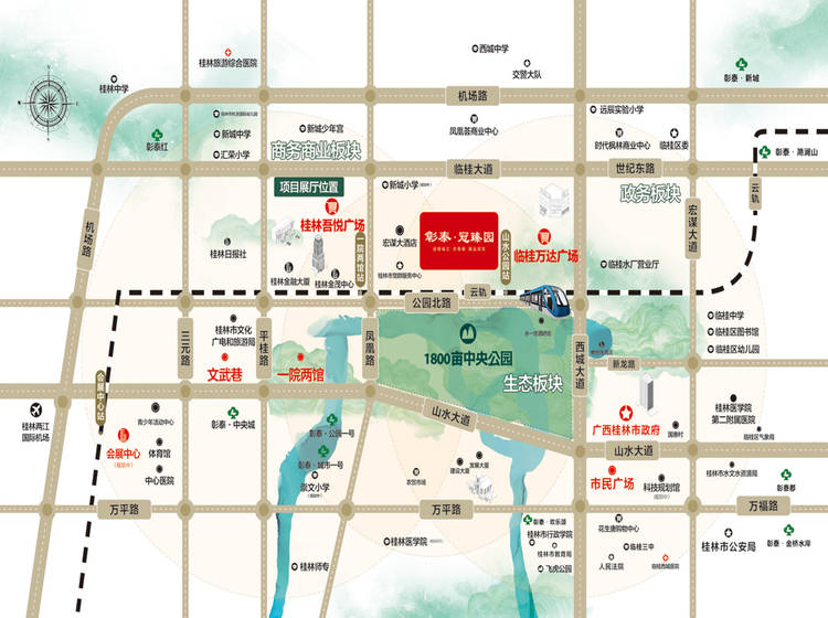 市政:市政配套环绕,桂林人文核心,会展中心、一院两馆、体育中心、日报社、金融大厦、广电中心等。