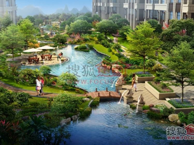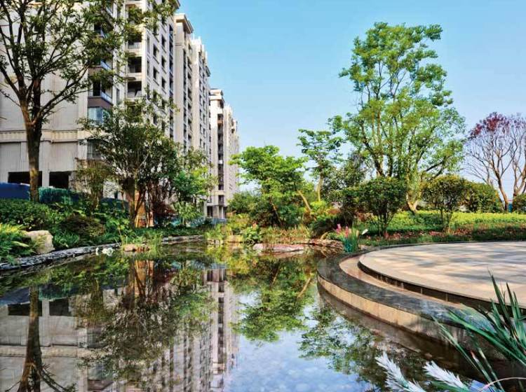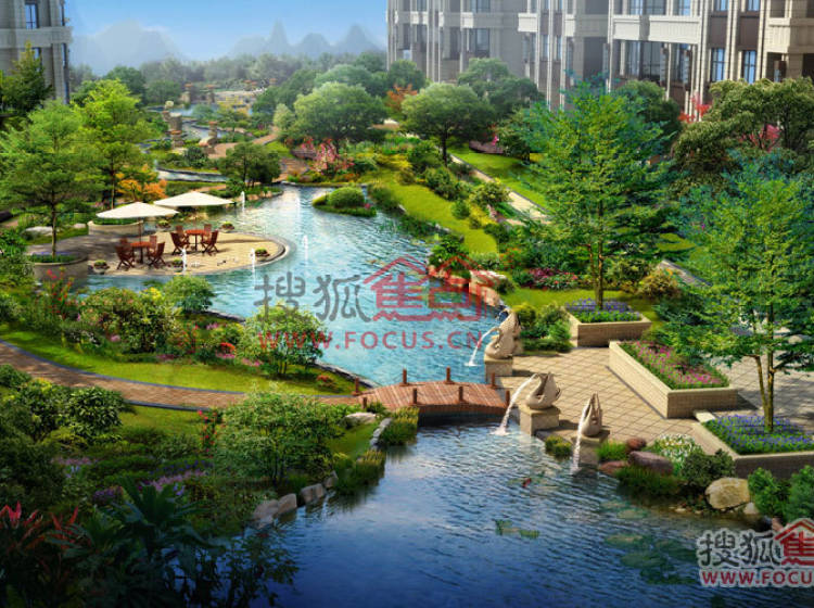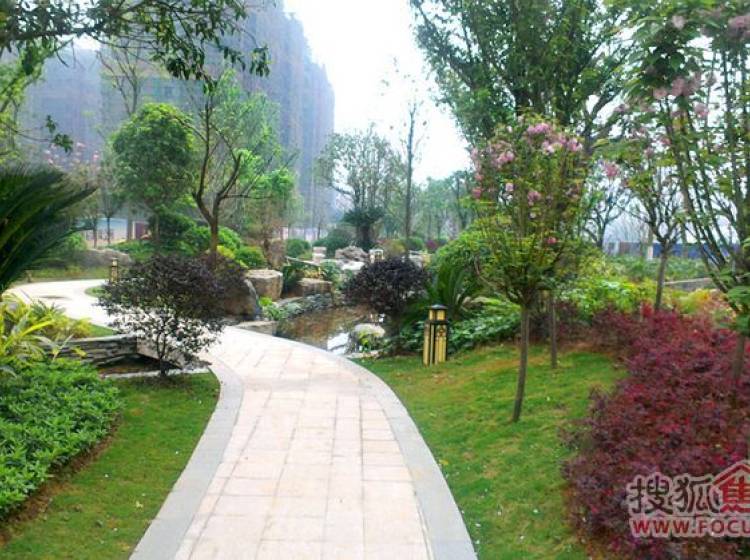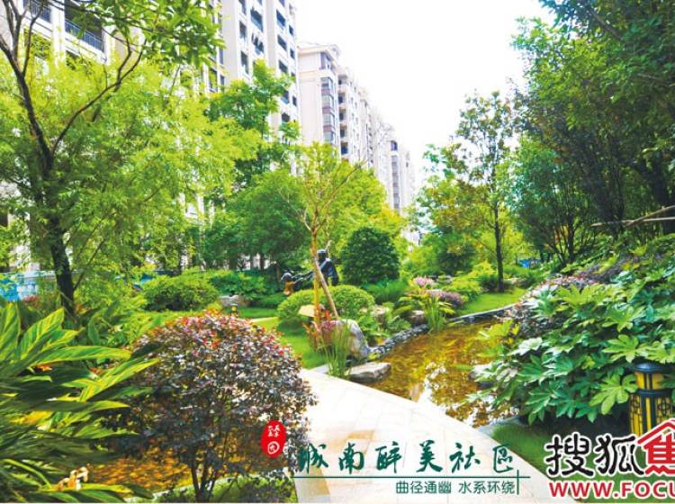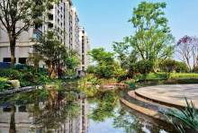 项目的园林则是围绕着240米的景观轴贯穿水系设计打造的,绿化设计结合水、亭、石、景墙等,种植了高大的乔木和灌木、以生态密林、花色花带等为基调,配合具体的地形和水体等区域特征,营造出色彩缤纷的自然生态空间。
