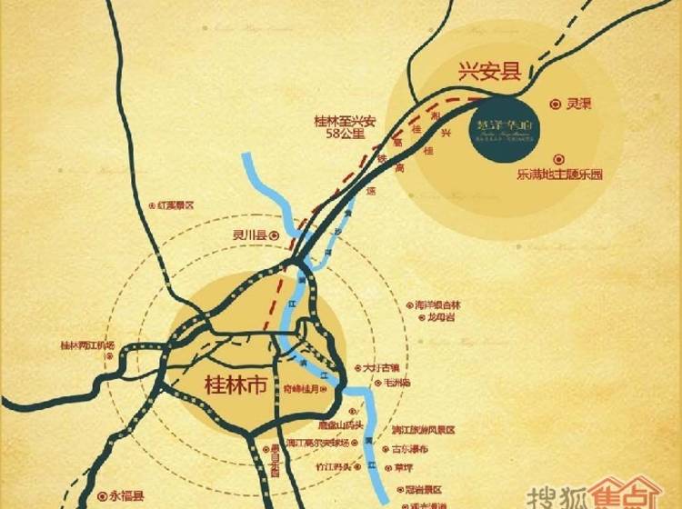 乐满地五星级旅游度假酒店、国际标准27洞高尔夫球场、兴怡度假山庄、灵渠公园、体育馆、银杏广场休闲娱乐综合区、兴安县人民医院、各大银行网点等。