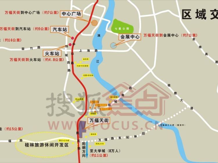 10分钟到达火车站、长途汽车站,25分钟到达漓江码头, 35分钟到达桂林机场