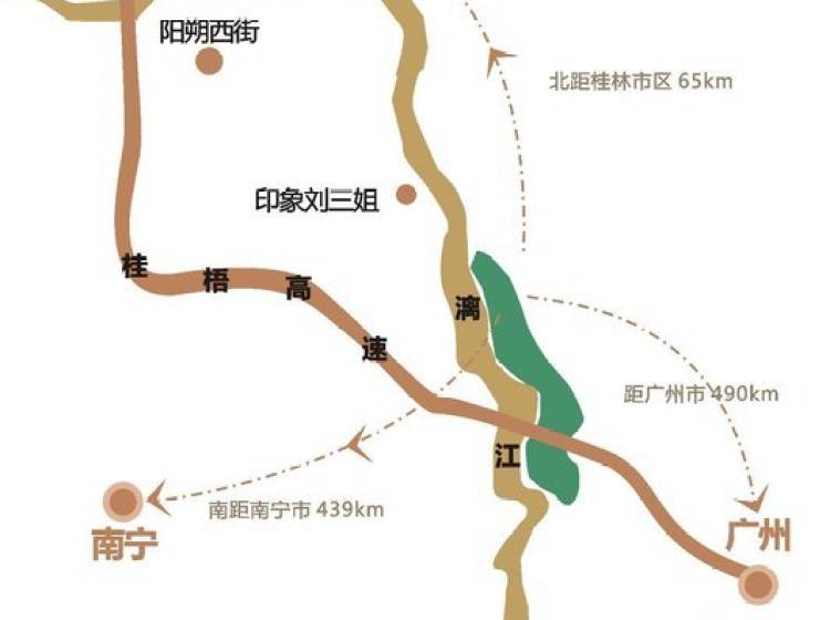 距阳朔县城18公里,距桂林市区65公里,至平乐巴士经过项目周边