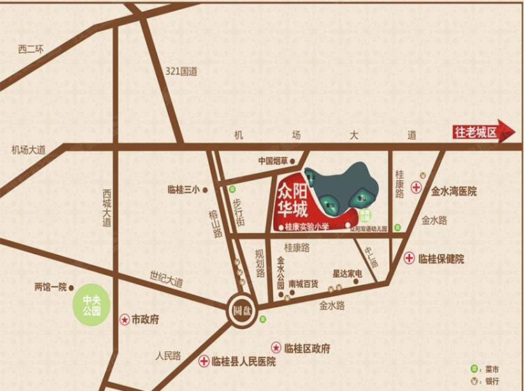 众阳华城位于临桂鲁山路29号,桂康路以北,榕山路以东,紧邻松山巷、桂康路、金水路、榕山路等城市主干道,正处于桂林老城区、临桂老城区、临桂新城区三个城区的重合点,无论向左走,向右走,都可以享受中心配套,进出三个城区都十分便利,驱车即到,可以全方位享受桂林老城、临桂县城、临桂新区三城城市现有、未来规划的生活配套。 在市区可乘坐85路、91路在鲁山水泥厂站下车,过机场大道即到,坐88路、临桂班车在金水路站下车,沿机场路方向步行至松山巷路口左转100米即到。自驾车可从金水路与桂康路交界口沿桂康路口进入,从榕山路与桂康路交界路口沿桂康路进入,从榕山路与松山巷交界口沿松山巷进入,从机场路与松山巷交界路口沿松山巷进入。