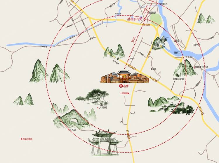 项目位于阳朔城南的石马圆盘,紧邻阳朔交通主干道抗战路和321国道阳朔境内段(荆垭路),是阳朔新老城区的交界带,邻近老城区的核心商圈——“西街商圈”,良好的地理位置为其商业发展奠定坚实基础。随着城区及旅游环境不断发展,游客对商业需求的增长,政府往新区迁移,商业将自西街向南面发展已经成为必然趋势。