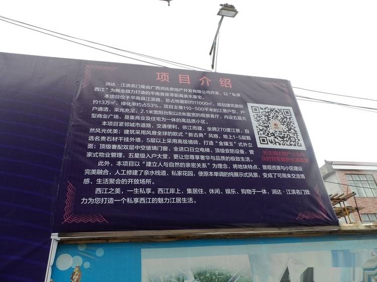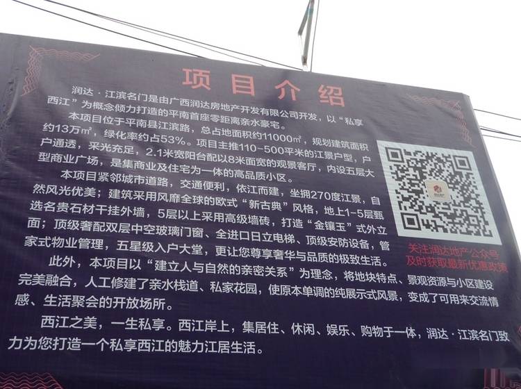润达·江滨名门项目介绍: 润达江滨名门位于平南县中心西侧,在西江环绕、树林葱郁、交通便利的黄金地段——江滨路(即乌江小学斜对面)。北面就是乌江小学分校(我们公司计划将投资打造乌江小学分校成为平南的江滨小学,配备良好的师资人员让它成为一所重点小学),南面就是我们美丽的西江湾,温暖的南风将迎面吹拂着我们,往西就是出城往金田方向的主干道,出行非常便利,往东5不到就能到达平南县城中心区。交通是非常的便利,地理位置优越,周边居住形态越趋成熟,小学、朝阳中学、还有龚州高中都在我们附近。医院、市场、超市等居住生活设施一应俱全。住在这里既能享有自然生态的生活,同时又能拥有城市生活的便利! 润达江滨名门项目是由广西润达房地产开发有限公司开发的,总占地面积约11000㎡,规划建筑面积约 13万㎡,绿化率约占53%。主要由5栋商住大楼组成;5栋大楼一字排开,外墙设计为欧式新艺术风格,黄金干挂石材,高档大气。风车型结构,沿江一线排开,开敞明亮,采光通风好。建筑结构为框架剪力墙结构,抗震性能好,预计今年年底就能整体封顶了。1-5层是商业,设有酒店、餐饮、百货、电影院等商业,是集休闲、娱乐、餐饮、购物为一体的大型商业,让您坐拥商业繁华。6、7楼和27、28楼设计为楼中楼,俯瞰西江排,独享一线看江景,楼中楼的套数有限,喜欢的得赶紧下定(目前6、7楼的楼中楼都已经都有客户下定了)。8-26楼是单套户型,三房、四房、五房任君选择。商住一体的设计形成了设施齐全的高品质小区。您在这里购房,自住可以坐享商业繁华,投资拥有无限空间! 称我们为真正的临江豪宅一点都不为过,项目南边0距离和美丽的西江接轨,出了入户大堂就是我们公司打造的亲水栈道,园林葱绿、黄金沙滩,还有豪华的游艇码头,这些都是我们业主私享的美景。这一切让美丽的西江湾成为了您家的后花园。 我们的临江豪宅不单只外观漂亮,还是安全性能超强的智能科技社区。每栋大楼分别采用独立的入户大堂,采用“一卡通”设置进门系统,电梯、停车场、入户门都要用“一卡通”刷卡进入。停车场安装了智能扫描系统,只要您的爱车进入扫描区域,无需伸手,自动扫描开门。电梯采用的是日立电梯,也安装了智能扫描识别器,轻轻拍卡,就能指挥电梯前来迎接您到您所居住的楼层。就算是同一栋楼的住户都不能随便的上到您的楼层,为您的安全护航。24的保安系统监控,科技与安保相结合,呵护您的尊贵生活,置身于智能科技社区当中。 在南面,我们设有两个地下停车场入口,负一、负二两层停车场,600多个停车位,为您的需求做准备。