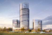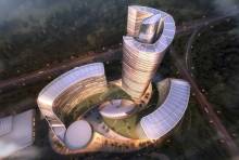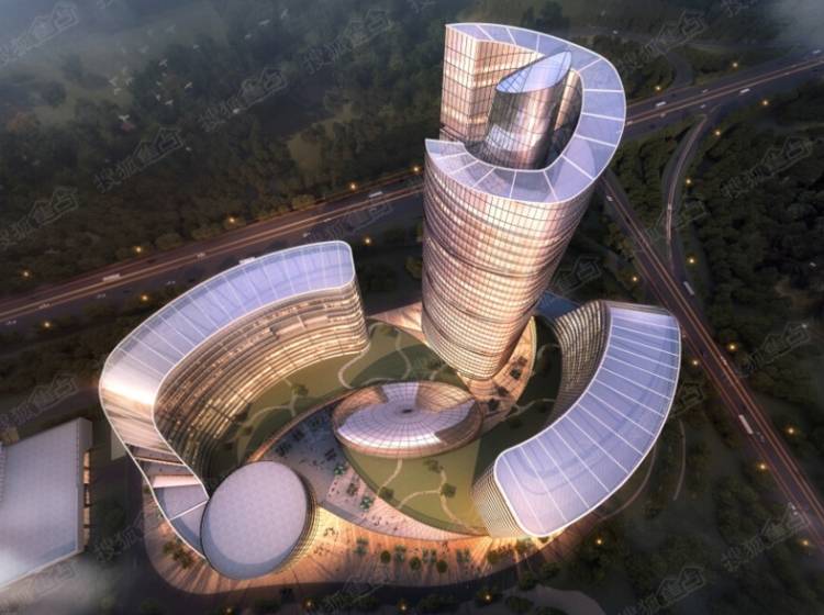 建筑整体材质,以铝板和玻璃幕墙为主,折射出强烈的金属质感,流线型的设计体现了项目时尚高科技的主导思想。辅以新技术,新材料以及节能环保等概念融入到项目整体设计,配合室外空间的大面积绿化打造绿色汽车城。