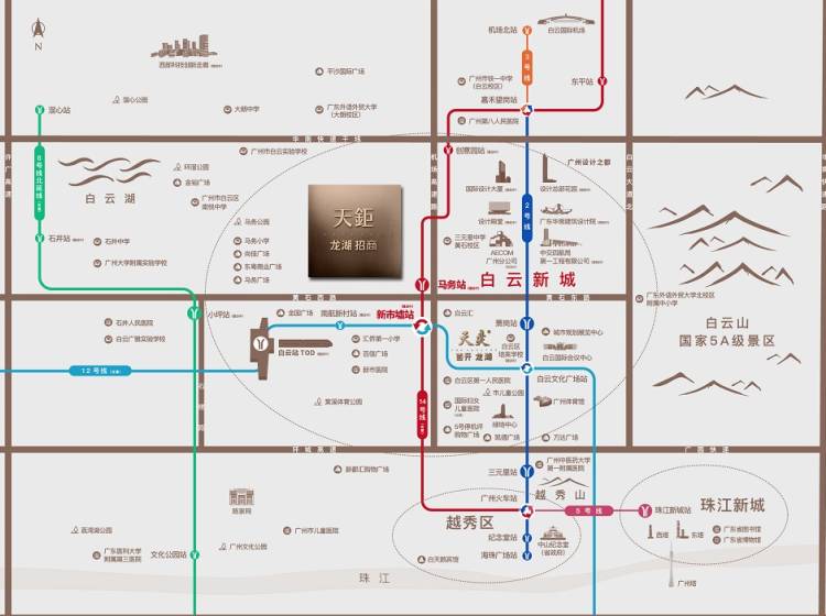 天钜周边多条地铁线路环绕,分别是2号线、8号线、12号线、14号线二期等。其中,项目距离14号线二期马务地铁站,直线距离约300米。通过14号线可换乘地铁2号线和12号线,北至白云机场,南至广州南站,西至白云TOD枢纽约3km(白云TOD枢纽时政府斥资440亿重金打造,预计2023年开通使用。未来棠溪TOD白云站建设体量超100万㎡,规模相当于3个广州南站)。