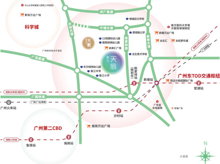 香江天辰为翡翠绿洲全新组团,天字系升级之作,占位城市东进“桥头堡”,左接科学城,右邻广州东TOD。门前规划地铁28号线陈家林站,更有两纵三横路网、有轨电车2号线(建设中)、社区楼巴,主城湾区随心达。20年人居大城,配套一应俱全。外拥5大综合体,内享10万㎡醇熟商业;拥15年全龄教育,真正学霸基地;背靠陈家林,园林设置全龄运动休闲设施,现代人的都市桃源。社区蝶式全南向布局,全新建面约79-102㎡三至四空间,为生活创造更多可能。