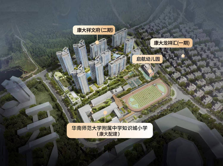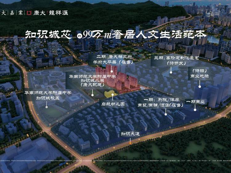 "康大龙祥汇项目总占地900亩、约60万㎡,总建面约80.8万㎡,是目前整个片区体量最大的楼盘项目,总体容积率低至1.22,是中心知识城体量最大、业态最全的超级人文大盘,打造区域高端人文生活平台,尽享繁华、人文、休闲、娱乐等丰盛配套资源。