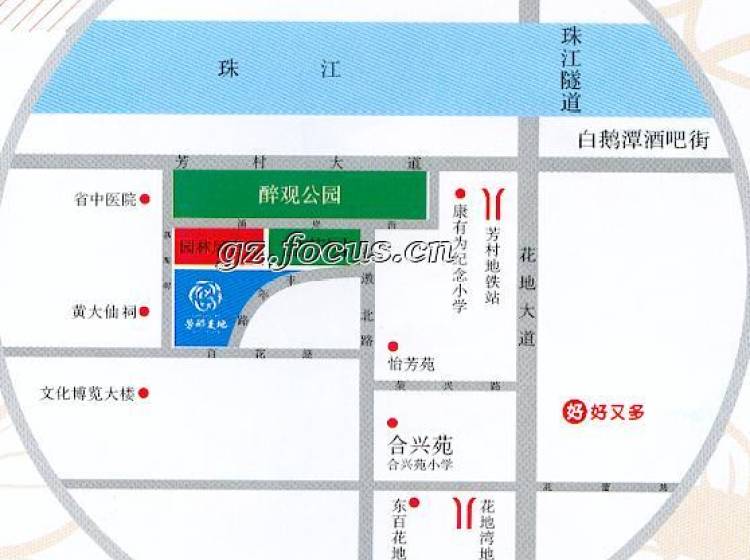 项目位于芳村居住人口最密集的花地板块,旺中带静,居住环境安静舒适。项目周边交通发达,离上下九商圈仅一江之隔。步行五分钟范围内有多条公交线路,步行十五分钟可达地铁一号线芳村站。项目所在地属原芳村旧区,生活氛围良好,周边配套完善,有省一级小学康有为纪念小学、广州慈善医院、芳村文化博览大楼、醉观公园等市政配套,银行、超市、食肆一应俱全。