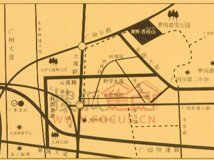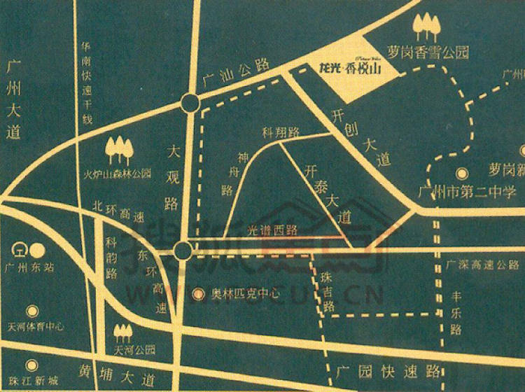 交通路线:广园快速——大观路——广汕公路——龙光项目;广园快速——-大观路——科学城——龙光项目;项目规划中的地铁6号线,计划2012年通车;公交路线:534(通往天河客运站)、B22(通往天河)、576(通往黄埔)、568支线(通往车陂)、449(通往天麓湖公园)