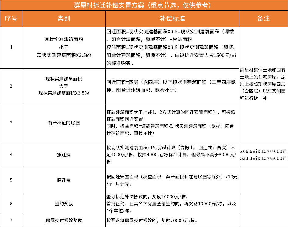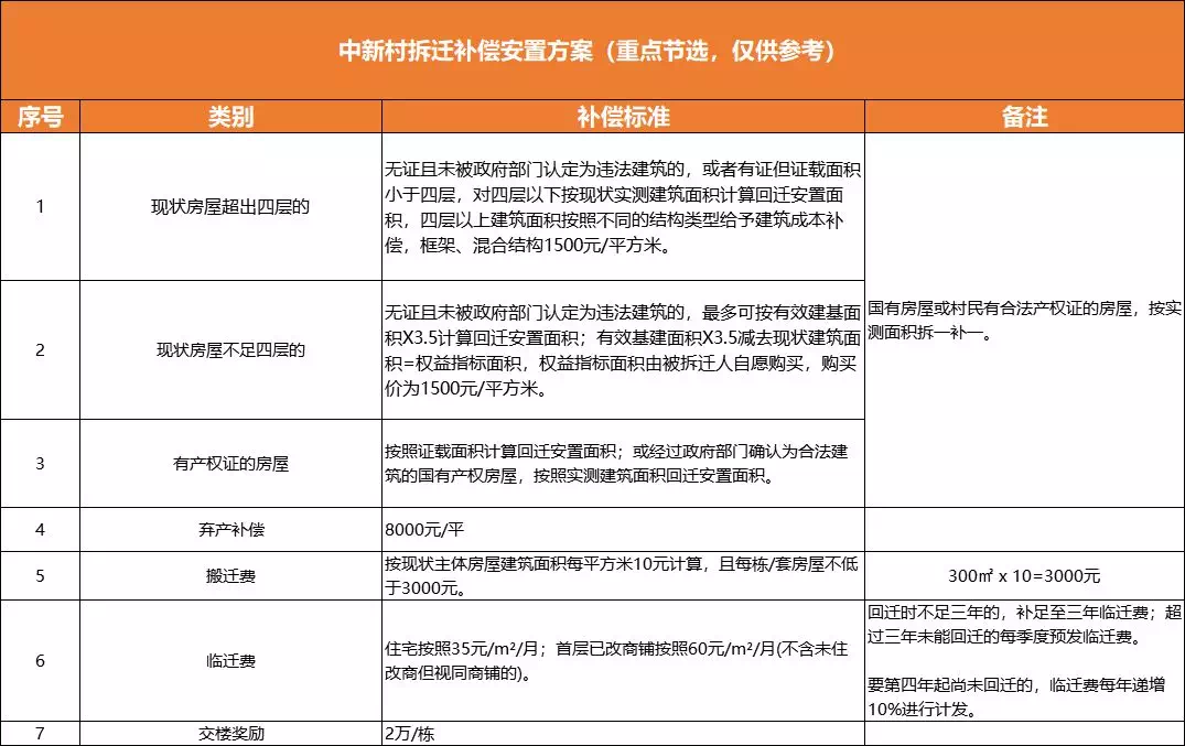房产君之前也收集了关于群星、中新、南坣这三个村的拆迁补偿方案大致的内容,其实目前对于房屋的拆迁复建赔偿方面,每个村都大差不差。(点击查看大图)