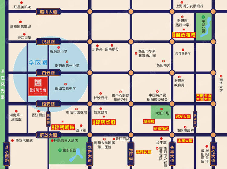 教育资源优势显著,祝融小学、衡阳市一中均为华新区好的名校,师资优良,教学设施完善,在给孩子好的教育的同时,还能在孩子成长路上一直陪伴,给孩子好的学习与成长环境。