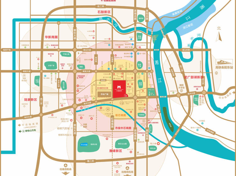 项目位于衡州大道与红湘路两条主干道的交汇处,衡阳主城区核心地段,交通十分便捷,教育、医疗、商业等配套完善,是衡阳市区高端居住人口密度较高的核心区域,整个项目与万达广场一路之隔,周边围绕众多新建住宅小区,项目分为南区和北区,由胡角路分隔。