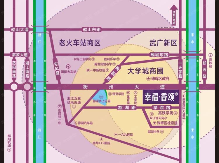 幸福香颂(原幸福园),珠晖区机关干部定向开发团购房,现对外发售,属于市重点项目,目前全体结顶,预计2016年年底交房。它是由衡阳珠晖建设开发有限公司精心打造,位于衡阳较具发展前景的武广新区,南邻即将修通的学院路,依湖南高铁学院,接 4000亩4A风景区酃湖公园;东靠衡阳市交通大动脉一环东路,紧邻五星级丽波国际大酒店,享美丽耒水风光。项目由13栋高层电梯房和商业裙楼组成,共1600户。建筑外形采用欧式西班牙风格以及欧式风情园林,98-136㎡双阳台经典户型设计,高品质的物业小区,不仅是您身份和地位的象征,也将给您带来超值回报。