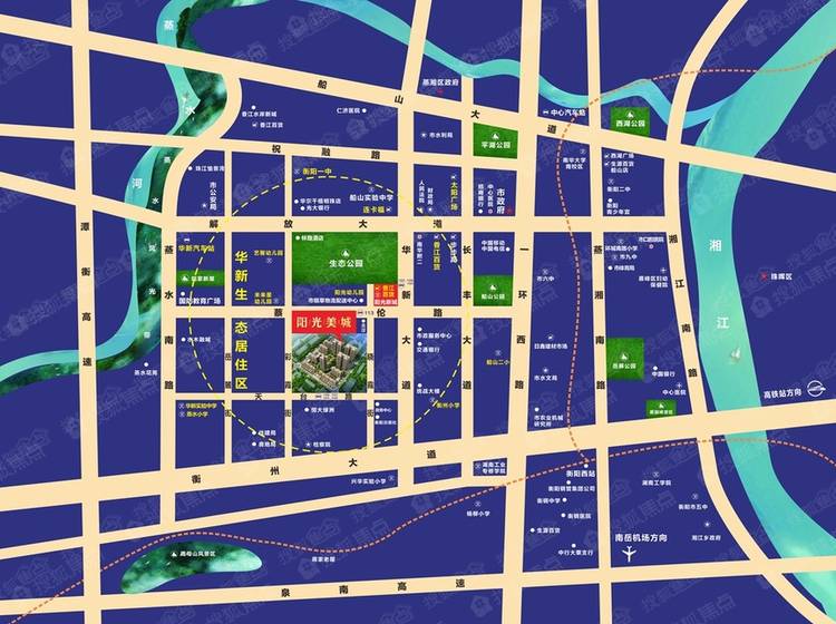 阳光美城位于华新区生态公园南(恒大绿洲正北面)。南北向的华新大道与东西向的衡州大道形成畅达通路。项目是由衡阳市百年房地产开发有限公司开发,项目总占地面积约90亩,总建筑面积约18万㎡(其中住宅15万㎡),共1184户,容积率2.6,绿化率40%。共11栋。其中首一期总建筑面积约10万㎡,共6栋700套住宅左右,主要产品户型为97-151㎡的全飘窗、大阳台、高赠送的三房及四房。