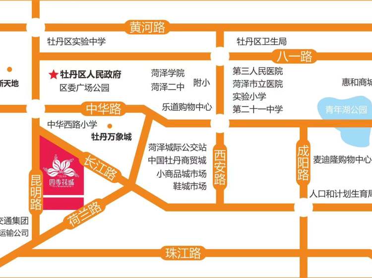 天华四季花城是菏泽天华房地产集团有限公司继天华牡丹万象城之后,在菏泽西部打造的又一商住综合体。项目位于220国道以东,长江西路中华西路小学对过(原长江纺织项目),交通便利,地理位置优越,配套设施齐全。以高层住宅、商业、写字楼项目为主,配套建设有商业网点、幼儿园等。