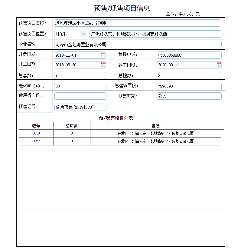 - 菏房预售[2019]883号 详情发证时间 2019-11-01绑定楼栋18#楼 27#楼