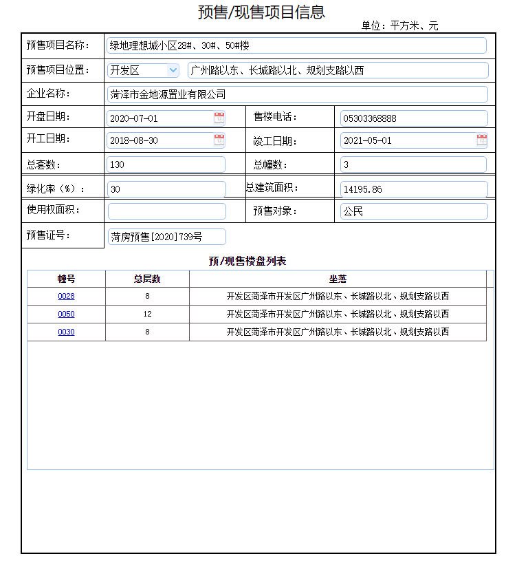 - 菏房预售[2020]739号 详情发证时间 2020-06-09绑定楼栋绿地理想城小区28#、30#、50#楼证件照片