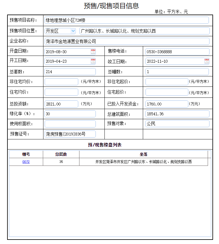 - 菏房预售[2019]836号 详情发证时间 2019-08-13绑定楼栋72#楼