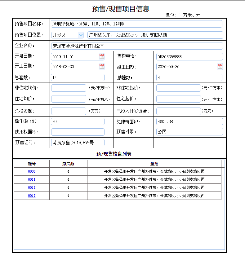 - 菏房预售[2019]879号 详情发证时间 2019-11-01绑定楼栋11#楼 12#楼 17#楼 8#楼