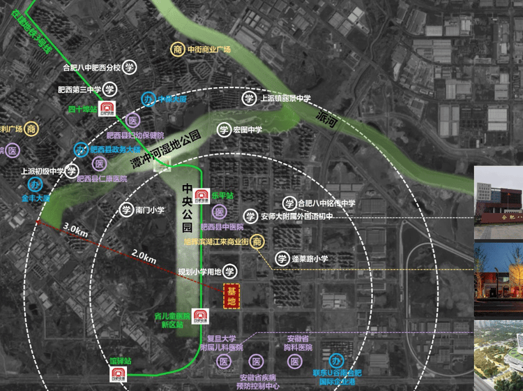 该地块临近合肥地铁三号线,靠近合肥市经开区,离滨湖新区省府板块仅有20分 钟车程。配套完善,周边有合肥八中、安师大附属中学,省儿童医院新区、省胸科医院,临近肥西县最大公园谭冲河湿地公园。