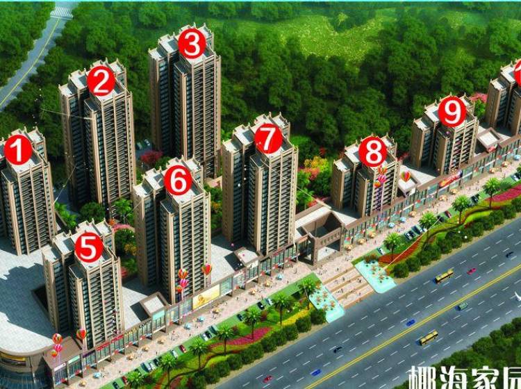 项目位于中山南路和椰海大道交汇口(椰海大道往西200米酒可以看到销售中心)。整个项目总建设用地:30840.95㎡,总建筑面积:133765.19㎡;住宅:80945.41㎡,商业:26037.9㎡;土地使用年限70年。共9栋,558户;1#、5#楼19层;2#、3#25层;6#、7#楼23层;8#、9#、10#楼12层。 住宅层高:3米,商业层高:高6米、低4.8米。