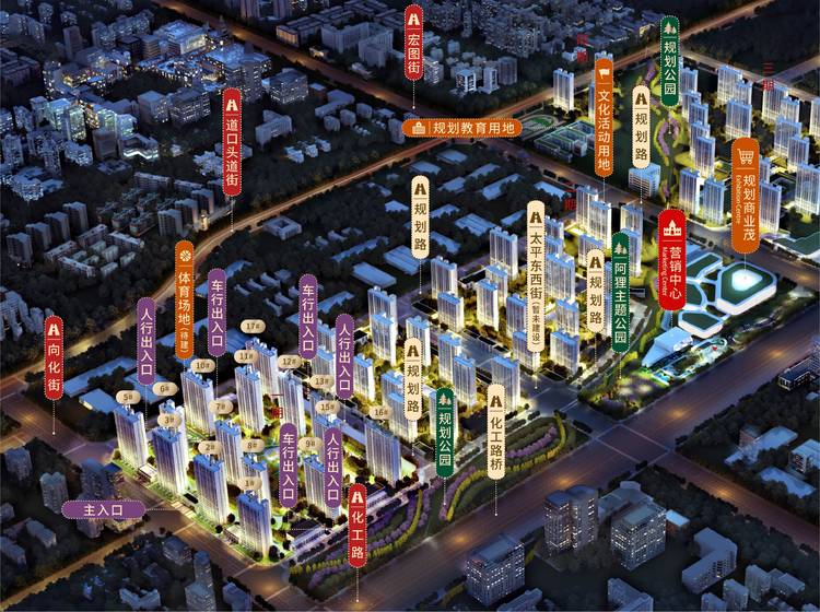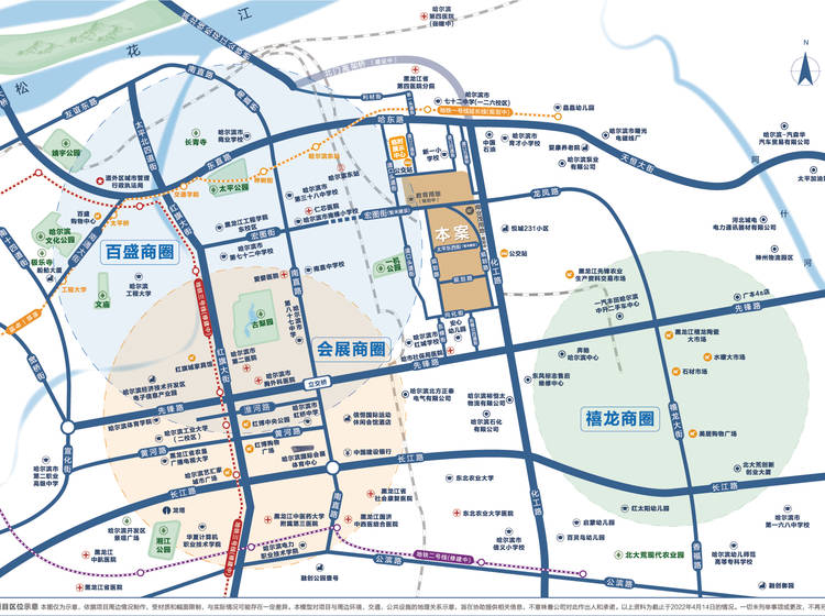 19 路、58 路、62 路、73 路、77 路、113 路、136 路、206 路、357 路、367 路、386 路等多条公交线路、地铁一号线、会展商圈、道外百盛商圈、禧龙商圈、规划约3万方商业MAL、规划九年一贯制学校、3所大型幼儿园、规划11.5万㎡的四大主题公园、项目周边有红城学校、新一小学、南棵小学、七十二中、三十八中、二十一中等多所重点高校。