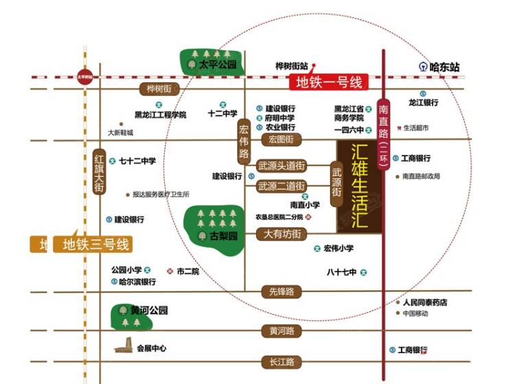 教育配套:宏伟小学、南直中学;商场:二商店、四商店;医疗配套:哈尔滨市第二医院、哈尔滨市胸科医院;休闲配套:古梨园、太平公园、宏伟公园;金融配套:中国工商银行、哈尔滨银行、邮政储蓄银行、中国农业银行。