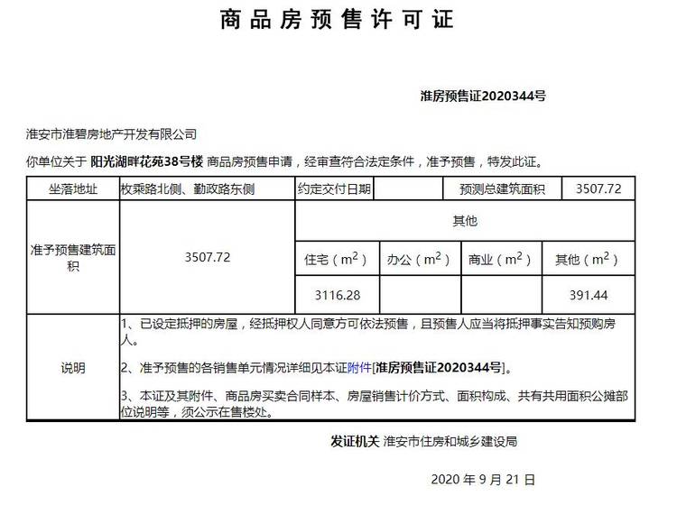 - 淮房预售证2020344号 详情发证时间 2020-09-21绑定楼栋38号楼证件照片