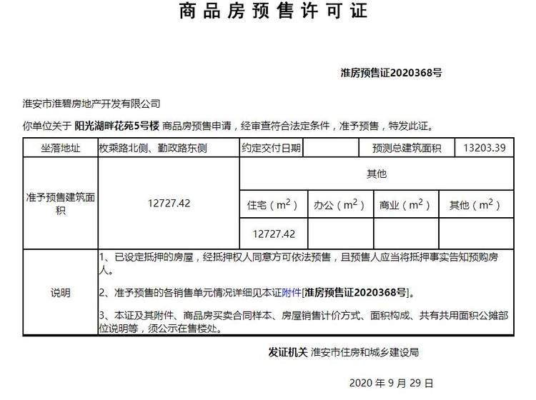- 淮房预售证2020368号 详情发证时间 2020-09-29绑定楼栋5号楼证件照片