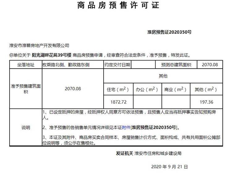 - 淮房预售证2020350号 详情发证时间 2020-09-21绑定楼栋39号楼证件照片