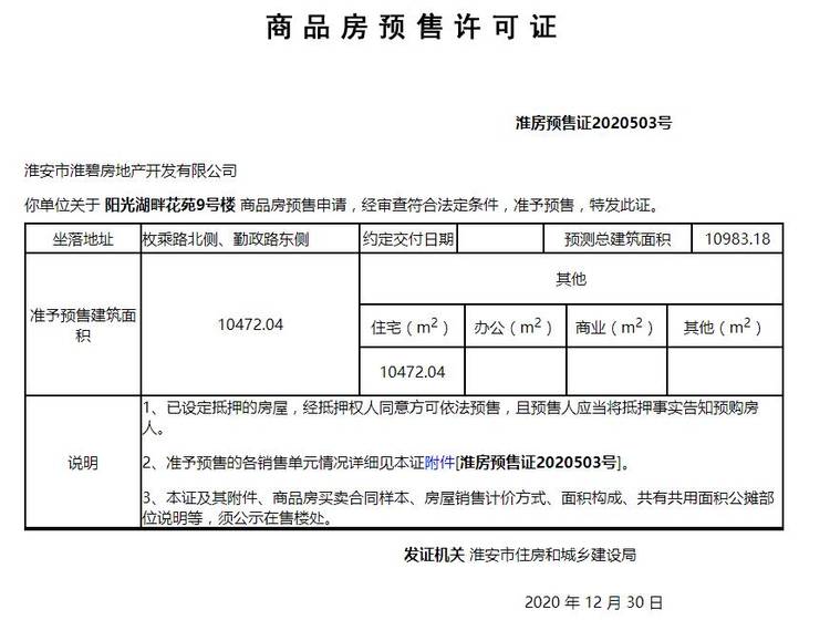 - 淮房预售证2020503号 详情发证时间 2020-12-30绑定楼栋9号楼证件照片