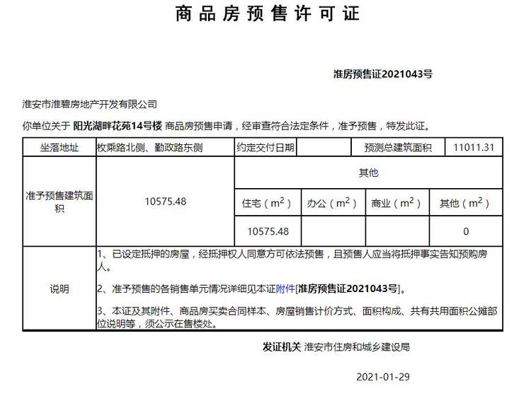 - 淮房预售证2021043号 详情发证时间 2021-01-29绑定楼栋14号楼证件照片