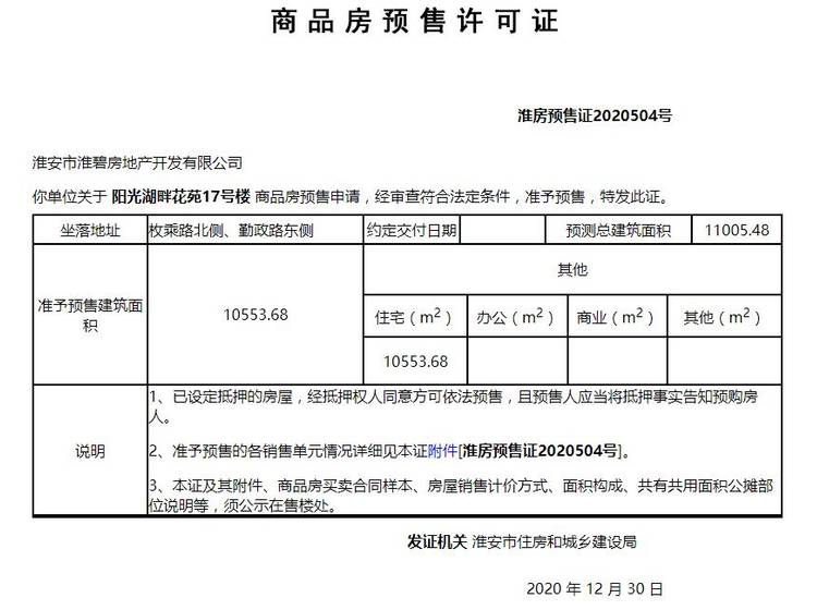 - 淮房预售证2020504号 详情发证时间 2020-12-30绑定楼栋17号楼证件照片