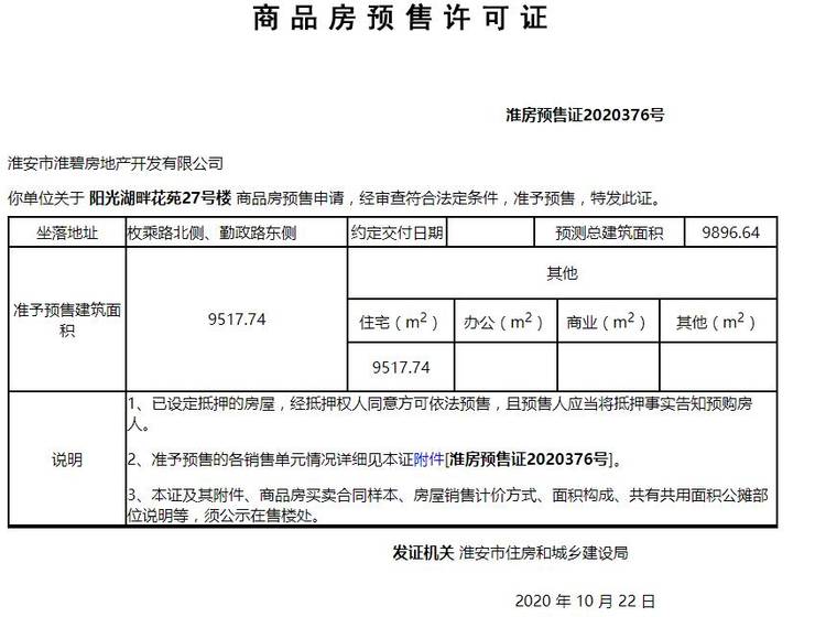 - 淮房预售证2020376号 详情发证时间 2020-10-22绑定楼栋27号楼证件照片